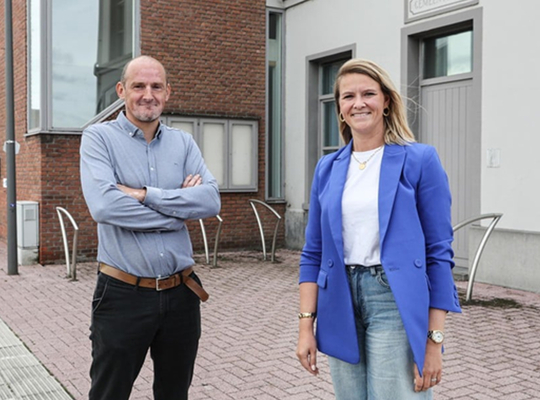 Lijsttrekkers Dries Van Hoof (N-VA) en Elien Bergmans (HOP) aan het gemeentehuis van Hulshout. — © koen fasseur GvA